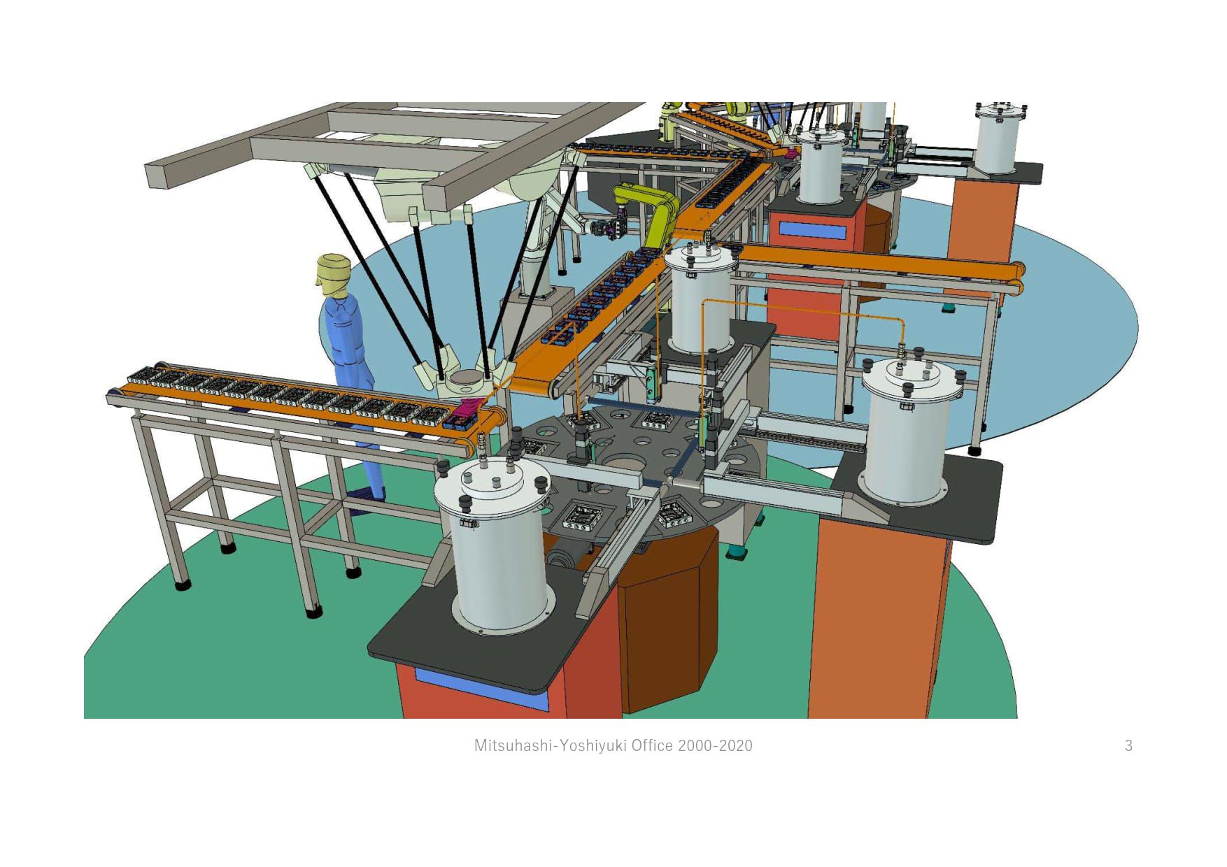 製造工程フロー対応の設備配置, AGV、複数階を有機的に連結する自動倉庫。バッファーの設置、メンテナンス、多品種少量、 生産能力の最大化対応。工場システムを俯瞰しながら、個々の工程設備がそのシステム適合型か否か?見直す設計作業。